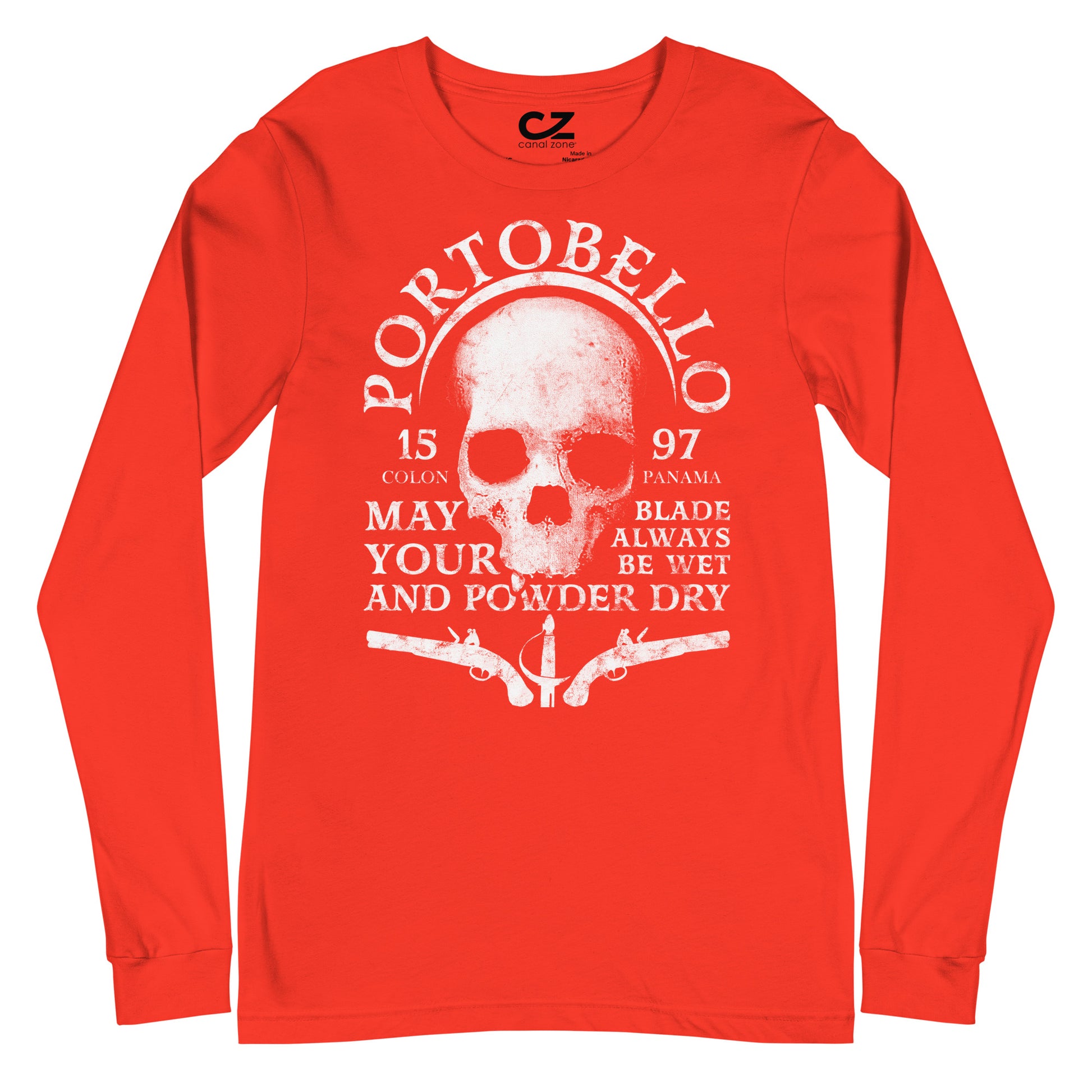 This isn’t just another skull tee—it’s a piece of Caribbean history. Based on a real skull photographed in Portobelo, Panama in the early 1900s, its design resurrects tales of Spanish treasure, pirate sieges, and colonial intrigue. Emblazoned over the skull is Portobello with “15” and “97” marking the founding year 1597. The eyes hold echoes of Colon and Panama; crossed era-pistols flank the bottom, a sword hilt stands central—and through it all runs a pirate’s credo: “May your blade always be wet and your powder dry.”